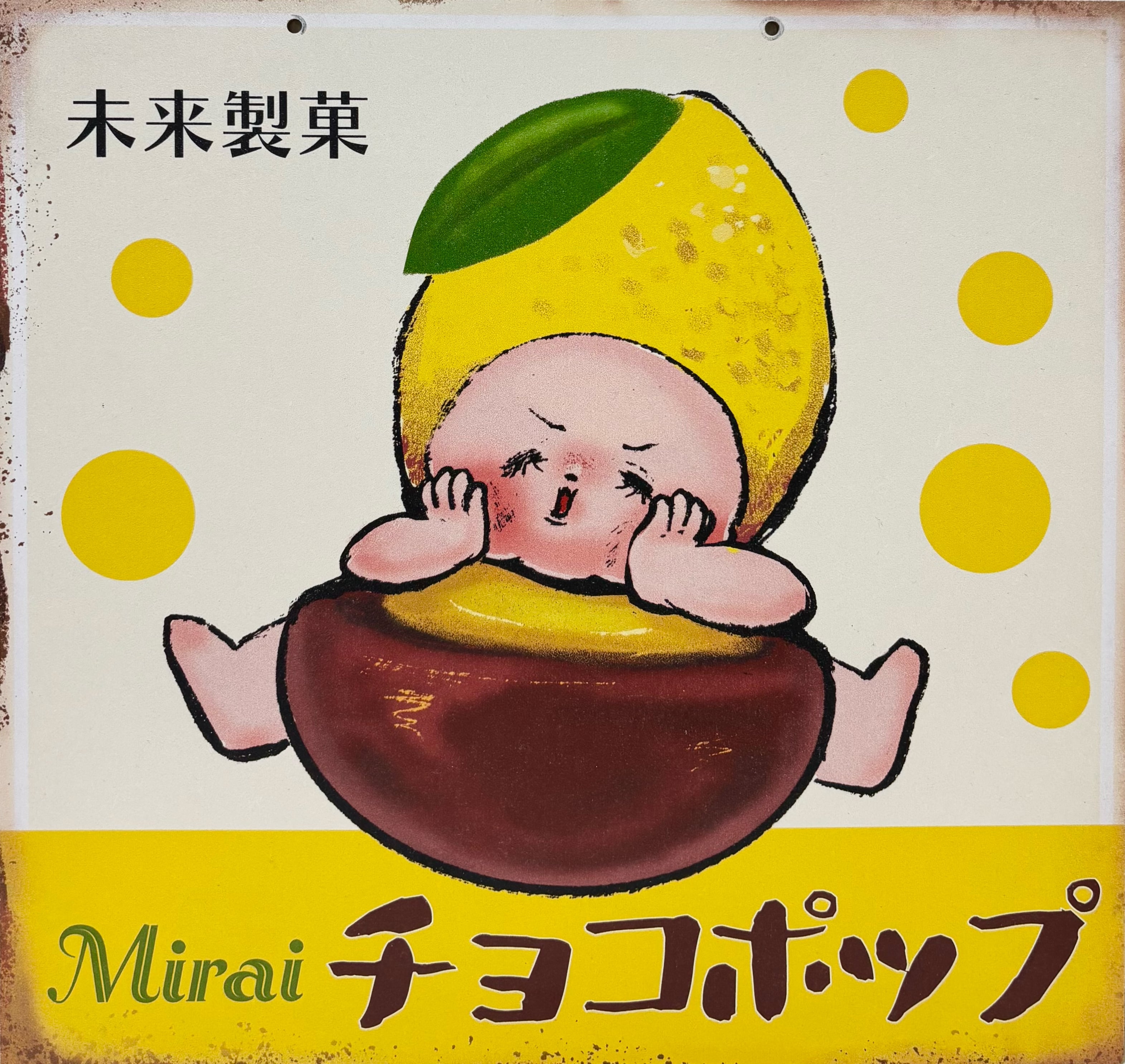 昭和の琺瑯看板をイメージした「架空の駄菓子シリーズ」。爽やかでポップなレモン味のチョコです。看板の錆の表現や、ザラザラとしたレトロな質感にこだわっています。